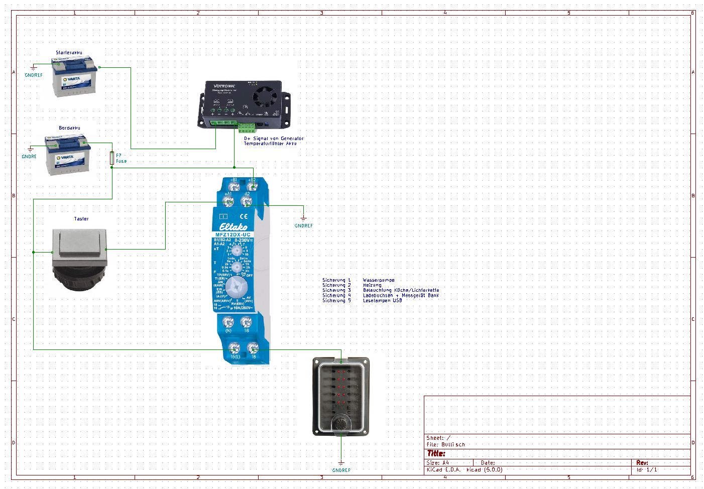 Einbau eines Eltako Zeitschalters für das Bordnetz. Mit Drück auf den weißen Taster zieht das Relais im Zeitschalter und schaltet die +12 Volt zum Sicherungsverteiler zu. Naochmaliges Drücken des Tasters schaltet das Relais wieder ab. Nach Ablauf der Zeit (aktuell eingestellt auf 4 Stunden x Multiplikator 4 = 16 Stunden schaltet das Relais selbstständig ab. Somit sollte der Bordakku sich nicht mehr entladen, falls das Ausschalten mal vergessen wurde. Die Leselampen mit integrierten USB Netzteil verbrauchen immer Strom.